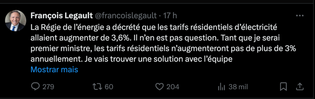 François Legault promete barrar aumento de 3,6% na tarifa de eletricidade no Québec
